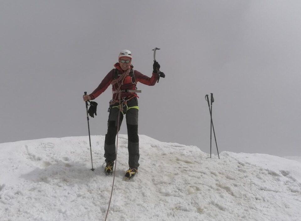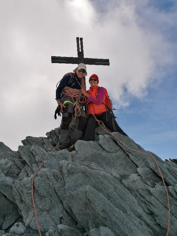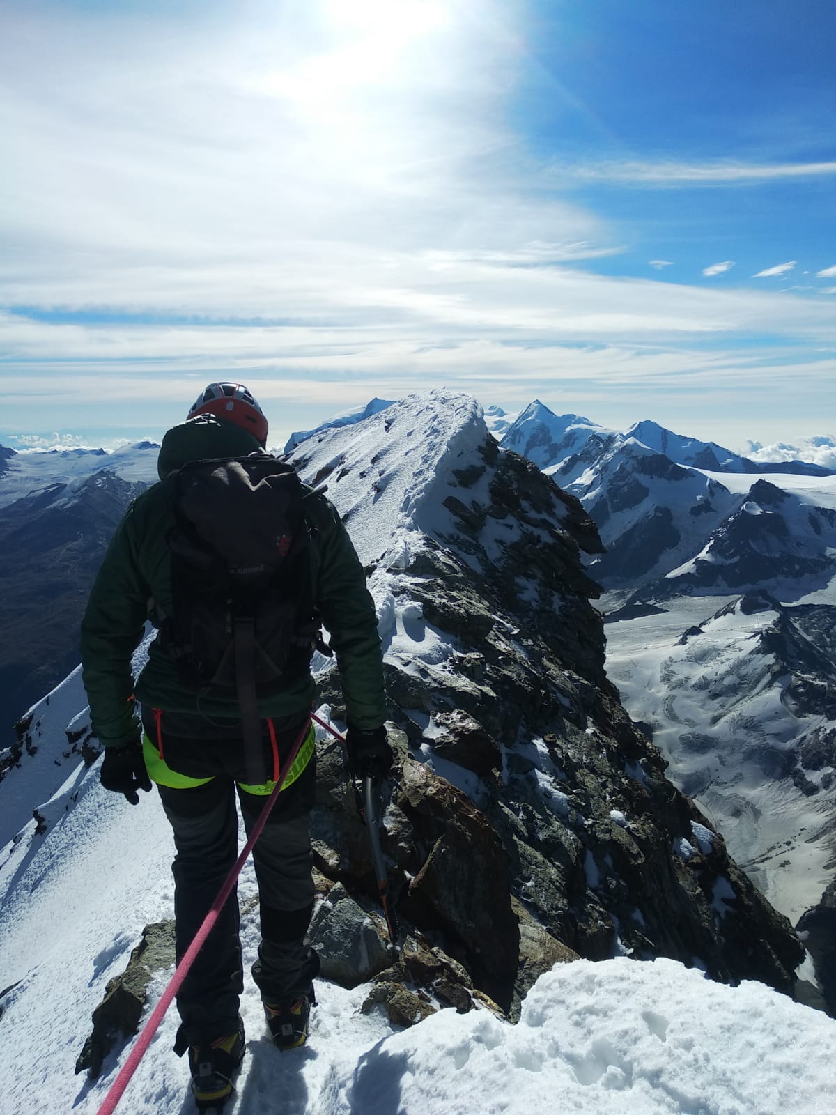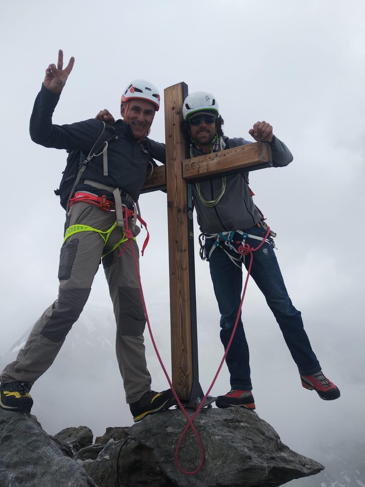 L’ascensió va passar sense incidents, encara que pel meu gust, massa ràpida, m’hauria agradat aturar més per gaudir del que estava fent i de les vistes. No hi va haver interrupcions i sense parar arribàrem als cims, ja que un cop aconseguit el cim suïssa, vam creuar l’esmolada aresta nevada fins a la creu al cim italià on vam fer l’única i breu parada per menjar i beure una mica ràpid i fer alguna de les poques fotos que vaig poder fer.