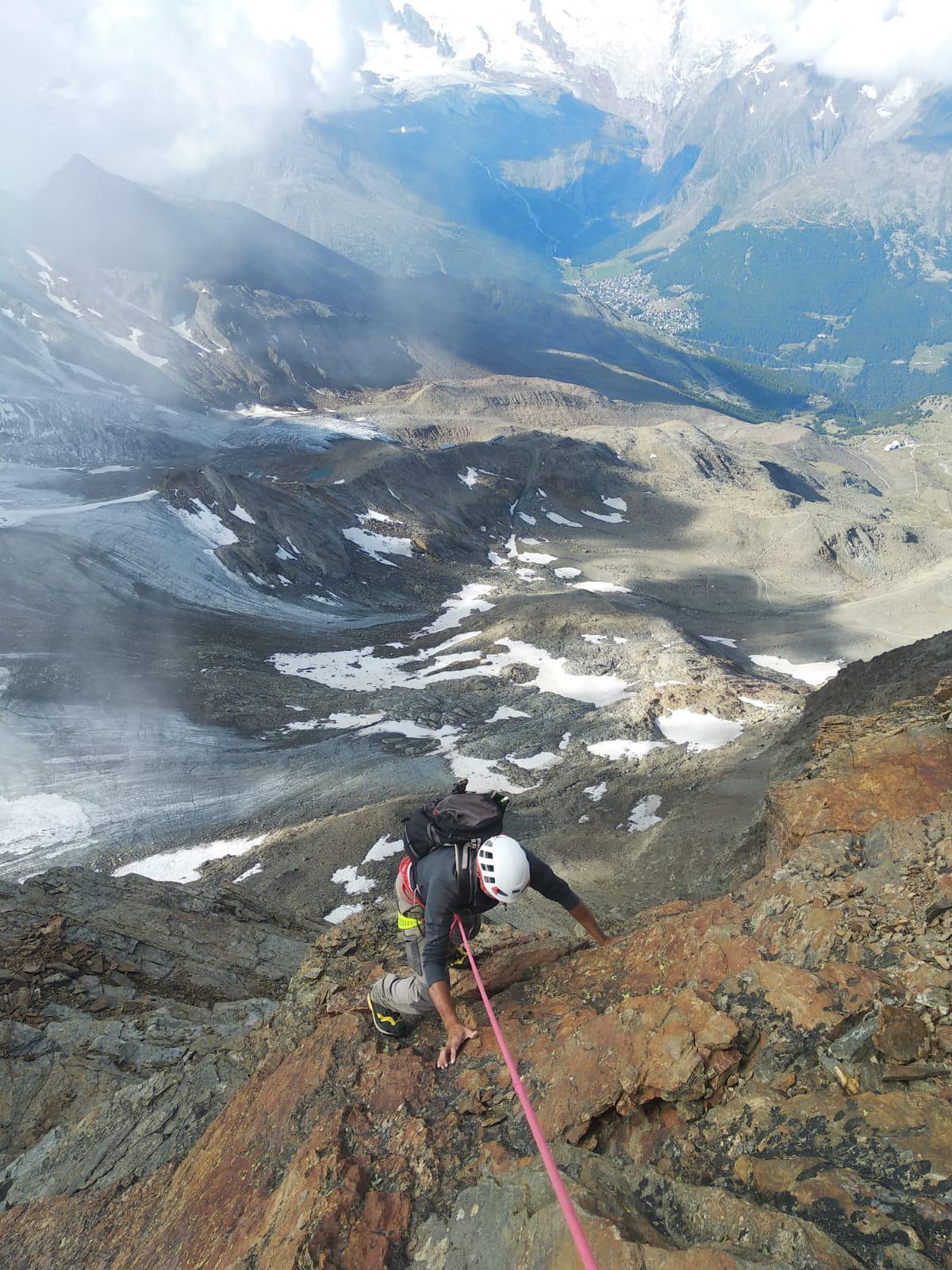 L’endemà, sense treva, vaig contactar amb un guia de muntanya que ja tenia concertat que m’acompanyaria en l’ascensió al Cerví, i ens dirigírem al Lagginhorn (4010 m.), famós per la seva preciosa aresta est, on ens vam provar. Es tracta d’una aresta molt aèria amb passos d’escalada en roca de grau IVº i nombroses grimpades i destrepades amb ràpels i despenjaments de fins a 25 metres. L’experiència va ser molt gratificant, entre nosaltres va haver-hi bona sintonia i em va ajudar a prendre prou confiança en que seria capaç d’escalar el Cerví.