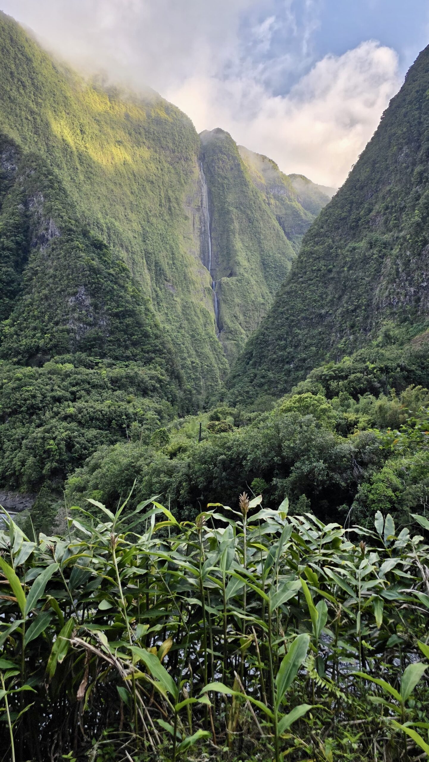 Retornem a l’activitat dirigint-nos cap al Ravine Blanch i la seva cascada de gairebé 310 metres. Però no és sols el barranc, l’aproximació de gairebé quatre hores dins selva espessa i amb fang fins als genolls ens fa estar atents per trobar el camí, sort del track que duem al GPS, sinó encara hi seriem cercant. Onze hores d’activitat acabant fusos ens fan decidir per descansar l’endemà.