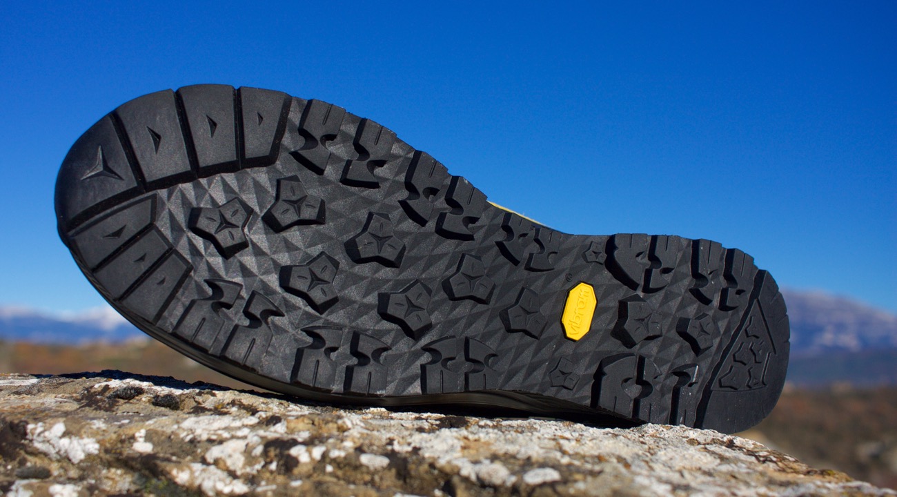 La sola Vibram Pepe Shelter amb compost Megagrip aporta adherència i subjecció, és excel·lent en tota mena de superfícies.