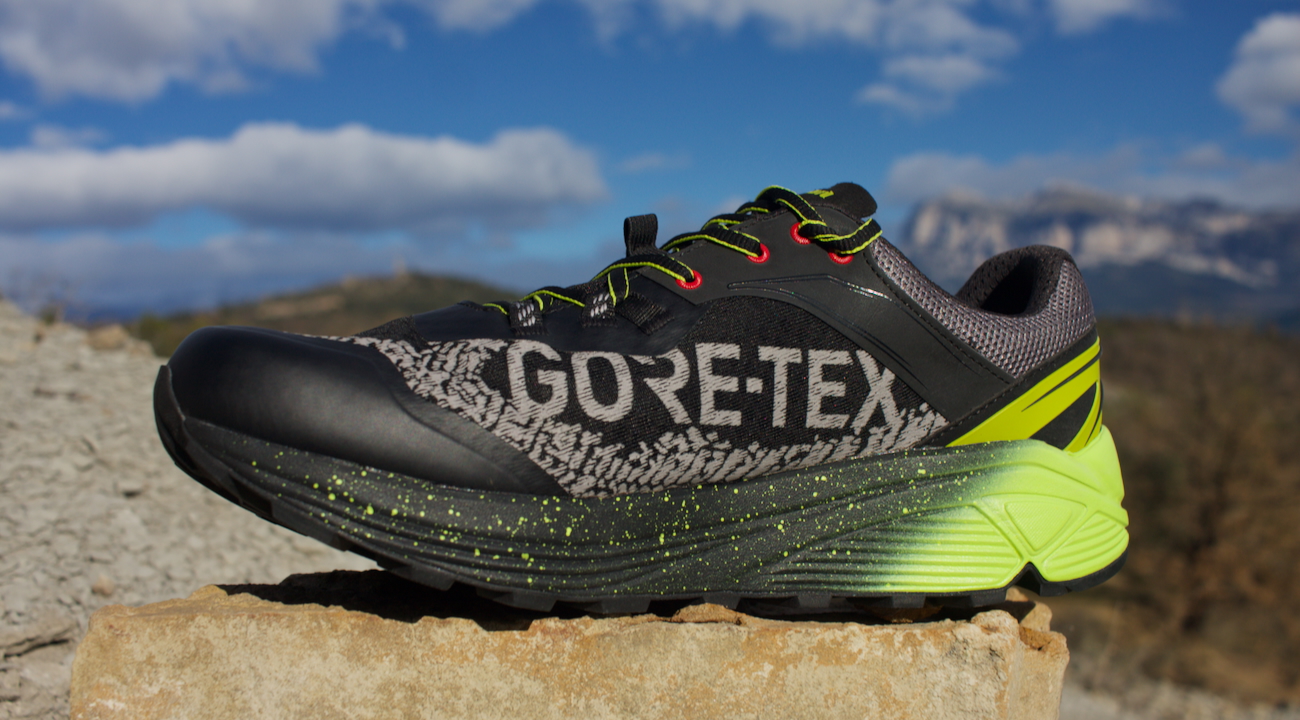 Els meus mesuraments del stack height –totalment casolans, és a dir, sense tallar les sabates en canal– m’han donat un gruix aproximat de 40 mm al taló i 30 mm al metatars (incloent sola, mitja sola i plantilla). Aquestes mesures situarien les Guepard GTX a la categoria de les sabates maximalistes. Pel que fa al drop, Bestard el situa a 8 mm, però la veritat és que sobre el terreny ofereixen un comportament similar a sabates amb drops més alts.
