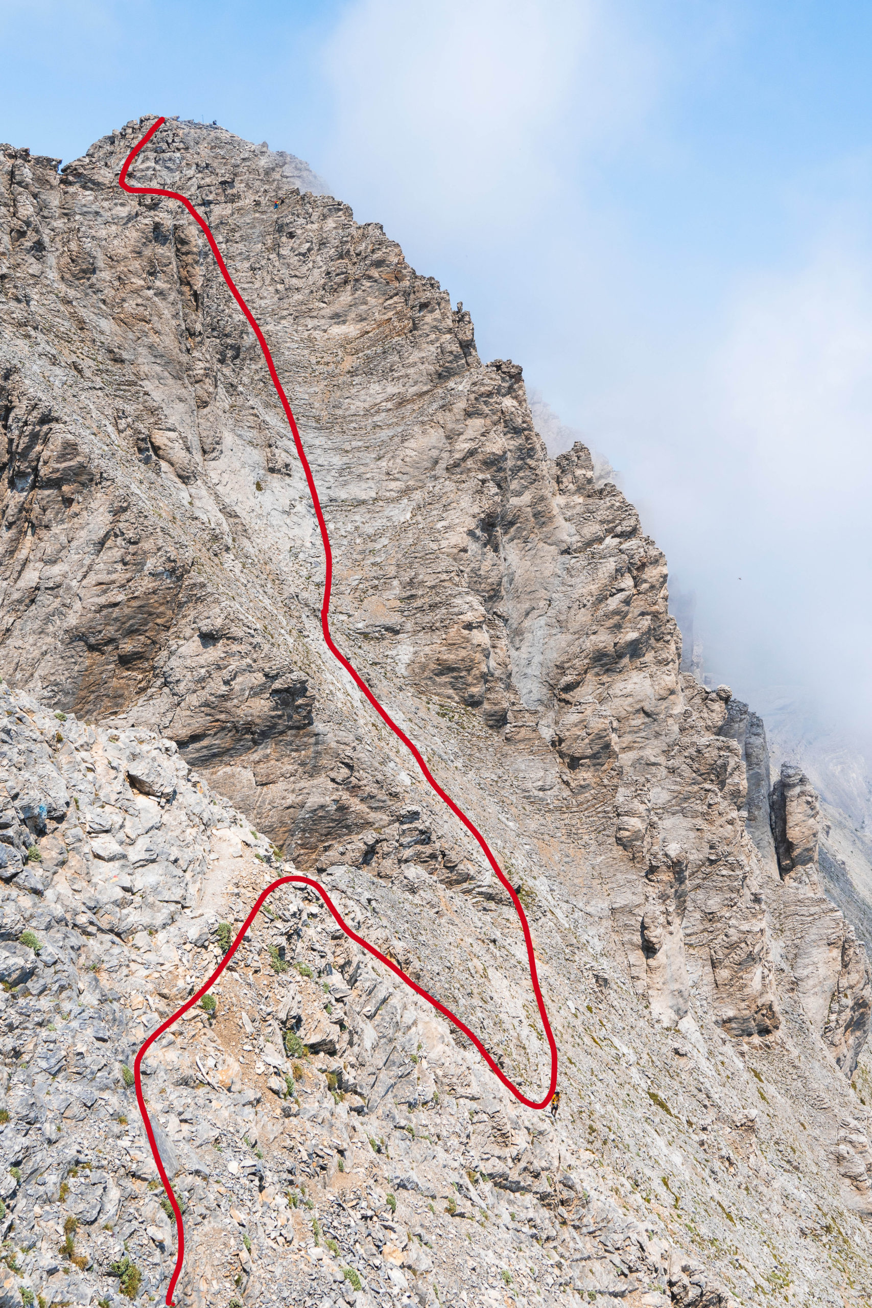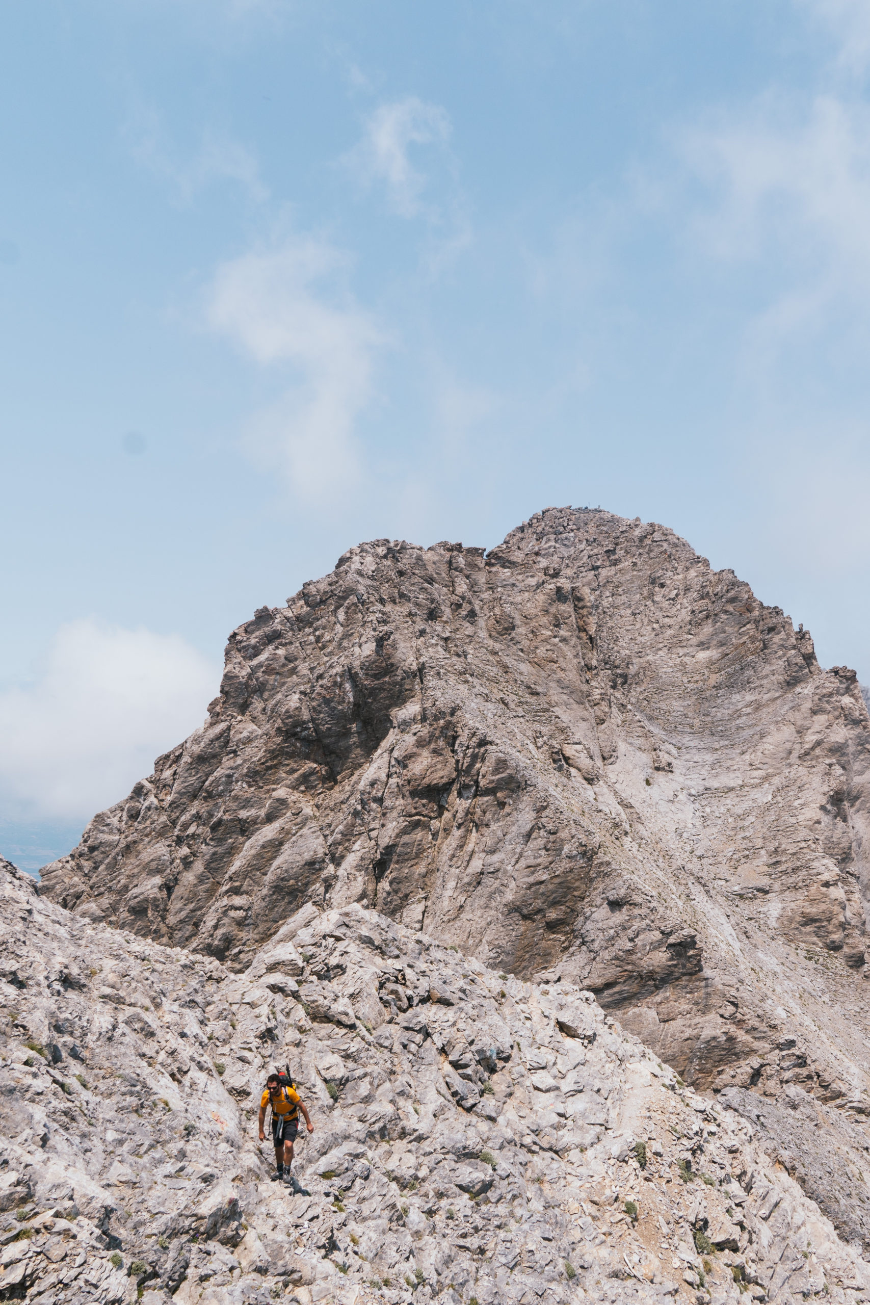 Un cop passat el refugi, la ruta segueix fins a les dues cimes que composen el Mont Olimp: Skala i Mytikas, que seria el darrer i més alt dels dos cims. Aquesta segona part és més complicada, ja que en poc més de 3km , s’han de pujar més de 800 metres de desnivell, i sobretot, abans d’arribar a Skala, l’ascens és molt seguit i amb gran pendent. Un cop arribats al primer cim, queda una de les parts més complicades , que és arribar a Mytikas, a través d’un coll gairebé vertical i extremadament exposat. Des d’adalt del Mytikas, realment, es pot entendre perquè durant la història aquest cim ha estat considerat la llar dels deus, la vista a 360 graus d’una bona part de la regió i de la mar, deixen sense alè a qui hi pugi.
