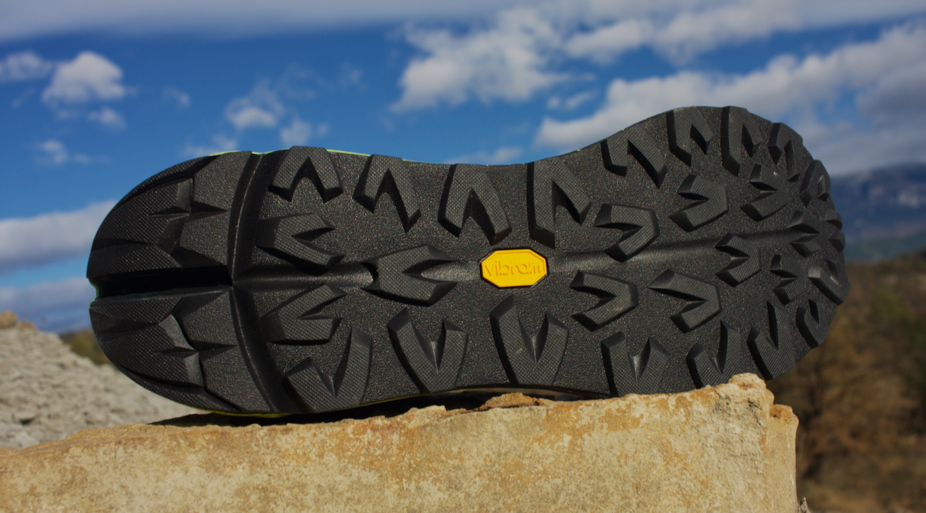 La suela Vibram® con compuesto Megagrip vaticina un excelente agarre en terrenos mixtos y adherencia inmejorable en roca, incluso en sectores mojados.