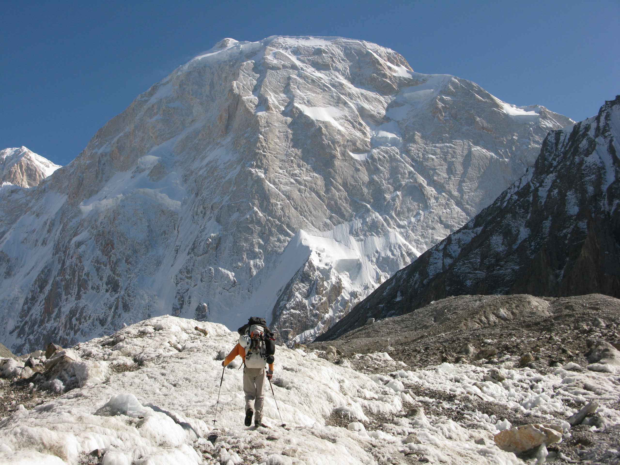 El Karakórum ocupa un lugar especial de amor y odio combinados en la mente de los montañeros. Allí todo es más extremo, desde el tamaño de los glaciares a la dificultad de la roca escarpada, pasando por los peligros objetivos de la caída de piedras, los seracs y las avalanchas. Aquí los altos sietemiles siguen ofreciendo un abanico de nuevas rutas. Sin embargo, aparte del K2, casi todo lo que he intentado allí no ha salido bien. Me encantaría repartir la culpa un poco más, pero no puedo decir que mis botas hayan hecho nunca otra cosa que no les pidiese: desde largos descensos por morrenas o travesías glaciares hasta delicadas escaladas mixtas en la cara N del Ogre o caminatas con la nieve hasta las rodillas a 7.500 m bajo el Gasherbrum 3, las botas siempre estaban preparadas para la situación, aunque quizás no el escalador. Aquí debo decir que ha habido muchos «premios de consolación» por debajo de los 6000m durante todos estos esfuerzos infructuosos, y las nuevas vistas e ideas que ofrecen son lo que siempre me hacen volver a por más castigo. Al menos puedo estar seguro de que mis pies no serán castigados.