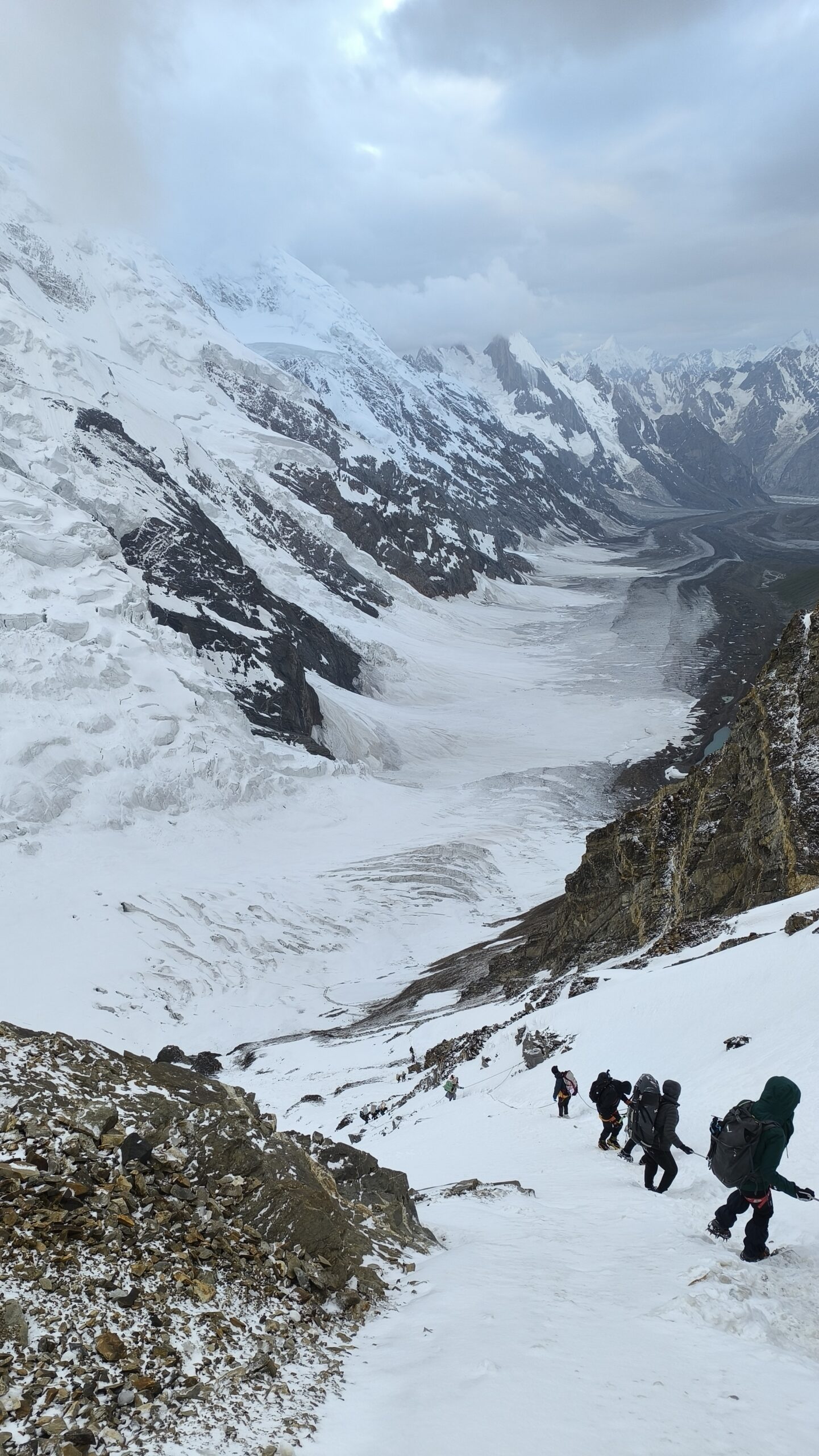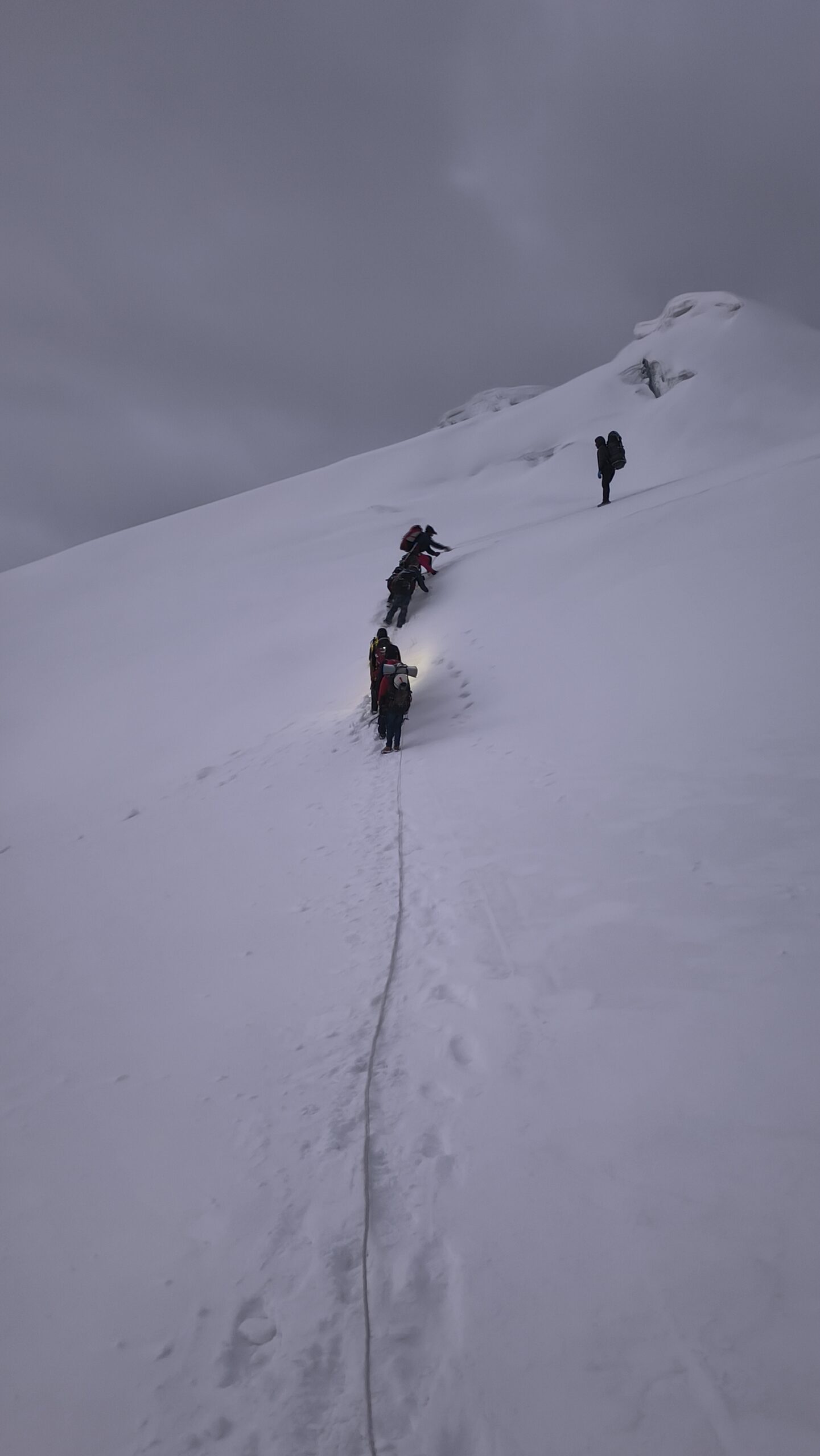Nos arrastras hacia el valle sin darnos la oportunidad de hacer nada. Cuando por fin se detiene estamos todos enterrados en mayor o menor medida. Poco a poco, entre todos, nos vamos desenterrando y tras encontrar y sacar al último componente del grupo que nos faltaba por localizar, decidimos dar por finalizada la aventura. Nos había caído encima dos tercios de la ladera del glaciar, que se había roto en placa a casi 6.000 metros, bajo la cornisa. Ese 17 de julio de 2024 volvimos a nacer. Perdimos parte del material, piolets, bastones, cámaras de fotos y demás cosas que quedarán para siempre en ese glaciar, pero salimos todos enteros de allí.