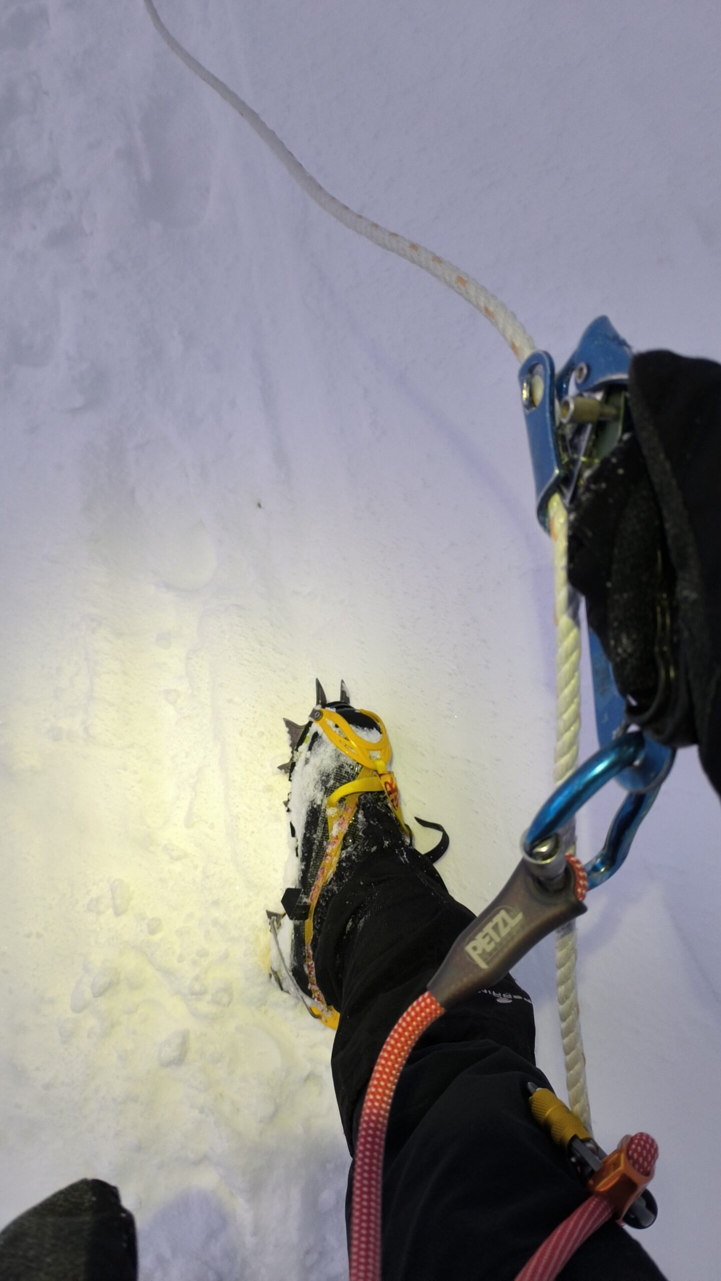Remontamos el glaciar West Vinge por la vertiente orográfica izquierda en grupos con frontales hasta que llega el momento de cruzarlo trasversalmente. Un kilómetro y medio temible, ya que está lleno de grietas cubiertas de puentes de nieve poco sólidos, de nieve blanda y primavera. No hace frío en el valle y la nieve está muy mal. Han marcado el trayecto con banderines. Los vamos siguiendo en silencio hasta que llegamos al otro lado. La pendiente comienza a ganar altura de manera progresiva y en breve pasa ya de los 40º. Llegamos a un punto donde se pone realmente vertical. Aparece la primera cuerda fija y nos anclamos a ella. El tiempo empeora y comienza a nevar con una gran ventisca. Va amaneciendo y vemos lo que realmente nos rodea.