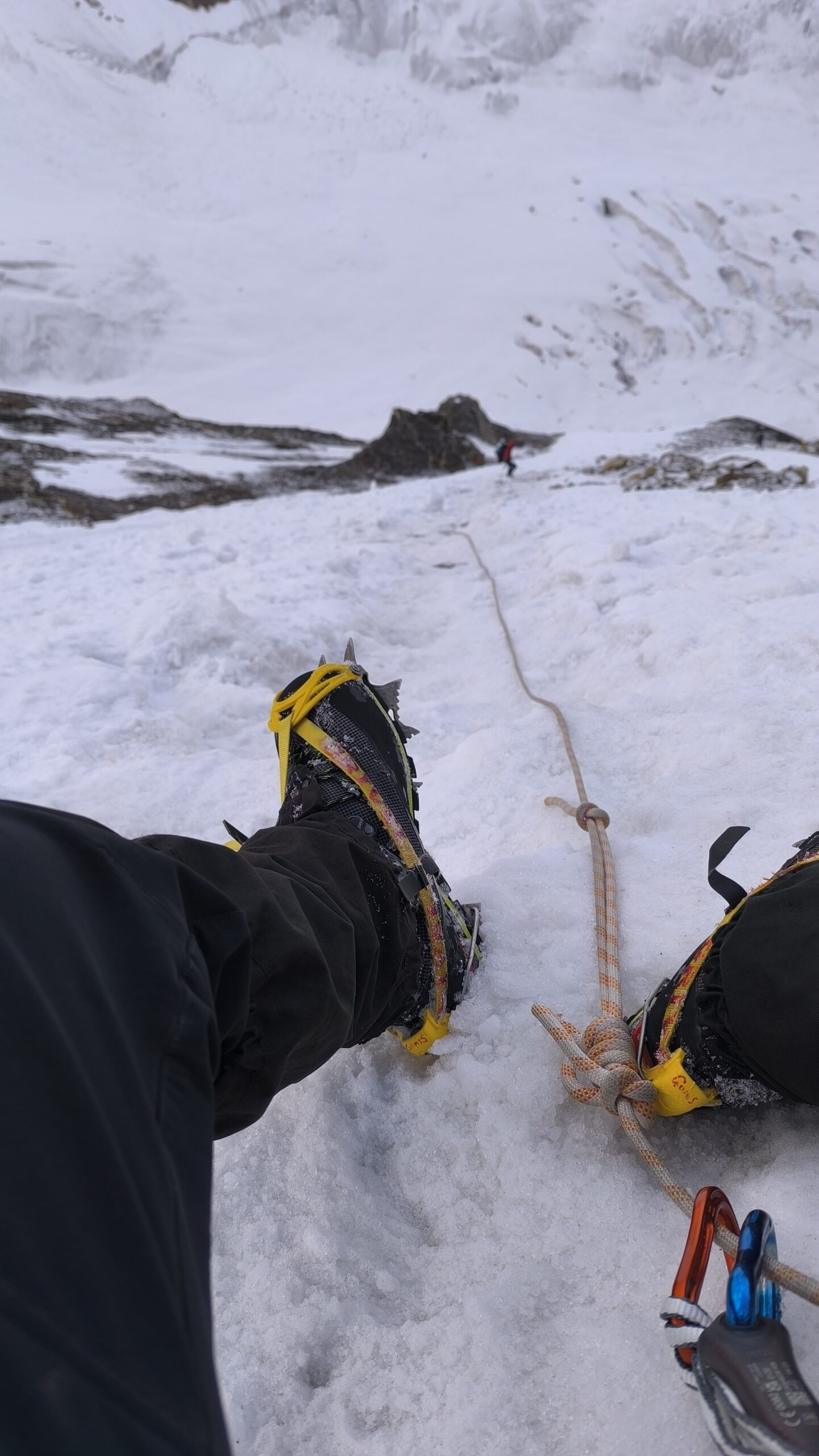 Botas de trekking avanzado modelo Phantom: usada durante todos los días de trekking y aproximación. Buen agarre con muy buena transpiración e impermeables. Muy similares al modelo que usaba antes, el Advance K Pro, pero a mi modo de ver, y puede que sea algo subjetivo, algo más rígidas y desde luego más duraderas por la calidad de la piel y las pocas costuras. A pesar de tenerlas pocos meses me han resultado muy cómodas y adaptables. Perfectas tanto en terreno desértico y caluroso de los primeros días como en las heladas jornadas a gran altura. Arena, rocas, hielo, ríos… Los pies siempre secos y protegidos, incluidos los días de lluvia. Talonera cramponable (semiautomáticos) con las que accedí a todos los campos base. Usadas también en Pirineos en invierno y en el Atlas marroquí en Abril. Perfecto resultado con ascensiones al Ras, Timezguida y Jabel Toubkal a -22ºC.