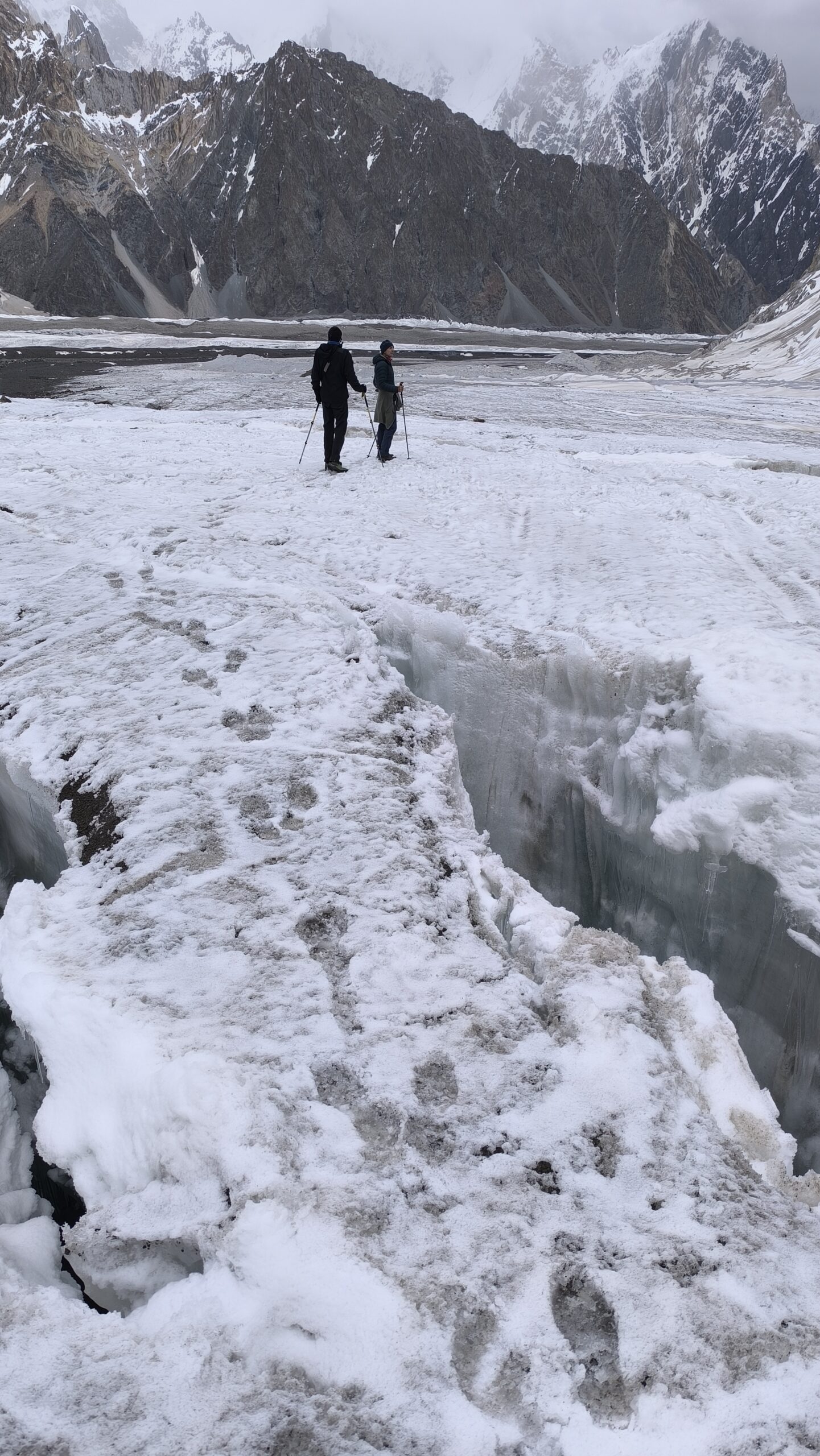 A partir de ahora toda nuestra actividad será ya sobre glaciares a excepción de alguna trepada rocosa. El glaciar Baltoro tiene una longitud de unos 60 kilómetros y una anchura de hasta de 3 kilómetros en algunos puntos. A su vez, en el Baltoro desembocan varios glaciares: el Godwin-Austen, que fluye desde el sur del K2; el Abruzos y varios glaciares del Gasherbrum. La confluencia del Baltoro con el glaciar Godwin-Austen se conoce como Concordia. Caminar por estos glaciares es un continuo sube y baja, esquivando lagos, ríos, grietas y piedras que caen. El terreno que se pisa es en su mayor parte rocas y piedras de granito arrastradas sobre el glaciar, pero también hielo que aparece por todas partes. Llegamos al campo llamado Gore-II tras 12 km.