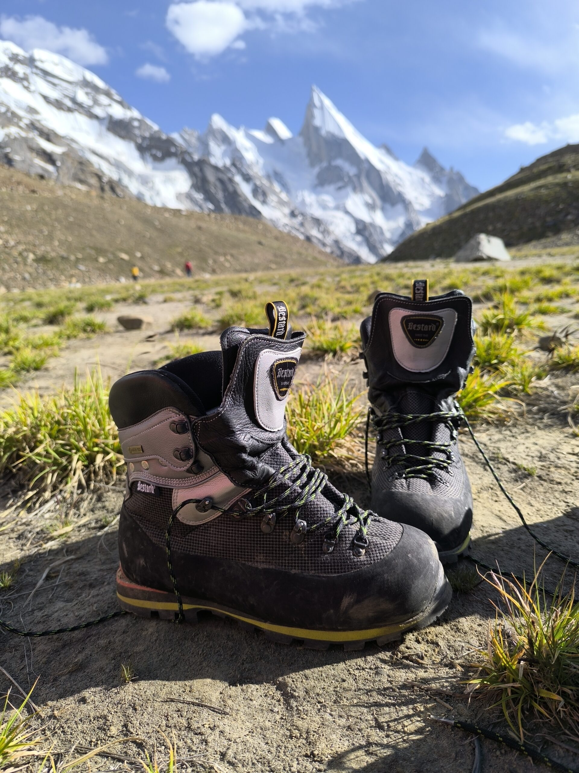 Botas rígidas modelo Top Extreme Lite: Definitivamente el gran acierto de toda la travesía. Un producto de excelente calidad, liviana a la vez que cálida y resistente. Sorprende la ligereza, a pesar de ser doble bota, y la adaptabilidad. Apta para grandes ascensiones pero tan adaptable y cómoda que permite largas travesías casi como si fuera una bota de trekking. Ofrece gran libertad de movimientos aun siendo rígidas. Con ellas hice el intento al Pico Pastore, soportó un alud, atravesé el Gondogoro pass y completé la travesía durante horas y horas sin ningún tipo de molestias ni rozadura. Las he usado con idéntico resultado este invierno en el Pirineo con muchas ascensiones en días realmente fríos. También usadas en travesías invernales en las sierras de Teruel.
